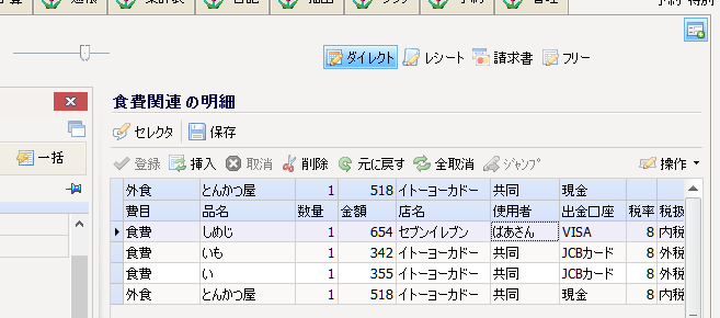 いくつかのショートカットキーに対応してますから、例えば入力順序を入れ替えるとかはとっても簡単。費目や 日付を入れ間違えたときの訂正にも便利です。